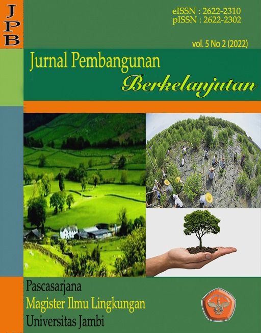 Vol. 5 No. 2 (2022)Journal of Sustainable Development is a scientific journal published by the Masters Program in Environmental Studies, Postgraduate University of Jambi and is used as a media for dissemination of research results in the form of full research articles, short communication and literature review on aspects of the Environmental Sciences.