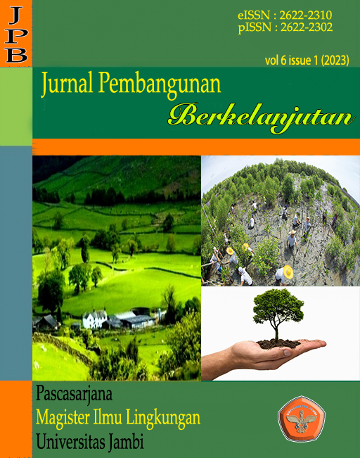 Vol. 6 No. 2 (2023)Journal of Sustainable Development is a scientific journal published by the Masters Program in Environmental Studies, Postgraduate University of Jambi and is used as a media for dissemination of research results in the form of full research articles, short communication and literature review on aspects of the Environmental Sciences.