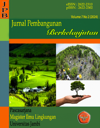 Vol. 7 No. 2 (2024)Journal of Sustainable Development is a scientific journal published by the Masters Program in Environmental Studies, Postgraduate University of Jambi and is used as a media for dissemination of research results in the form of full research articles, short communication and literature review on aspects of the Environmental Sciences.