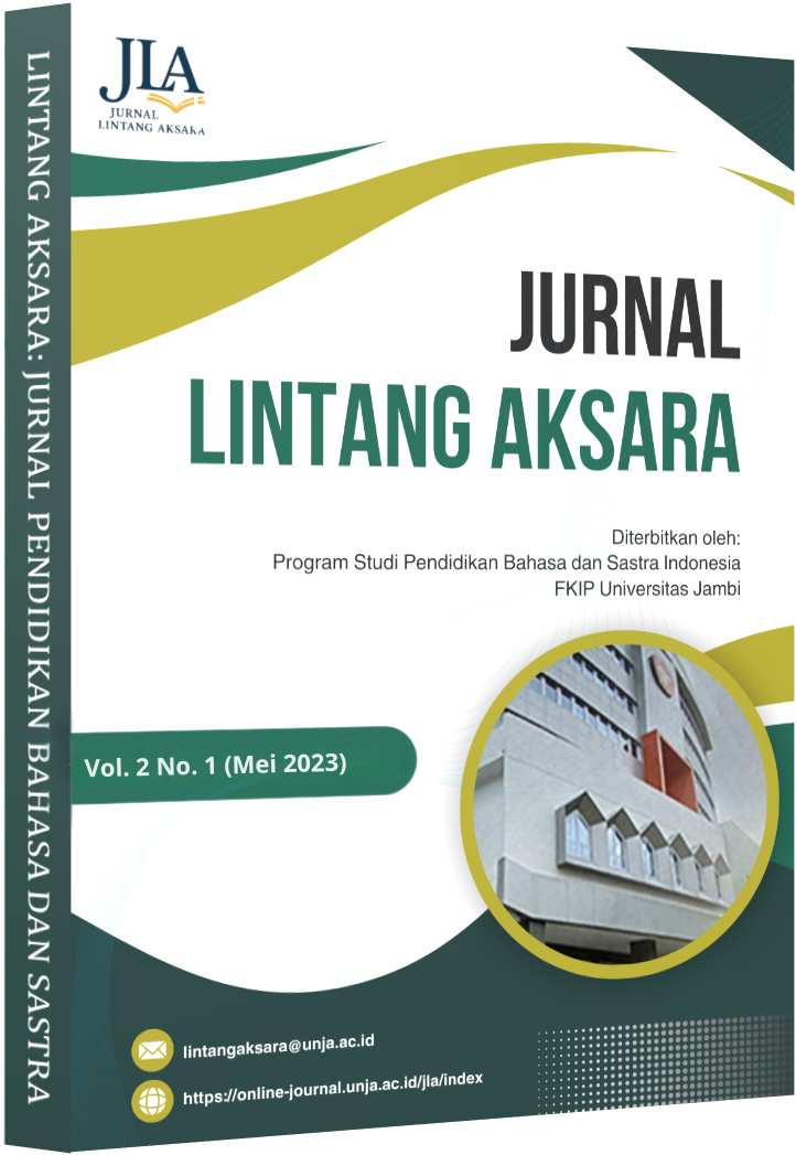 Lintang Aksara: Jurnal Pendidikan Bahasa dan Sastra Publisher: Program Studi Pendidikan Bahasa dan Sastra Kampus Pinang Masak Jl. Jambi-Muara Bulian KM. 15, Mendalo Darat Jambi. 36361, Jambi, Indonesia. E-mail: lintangaksara@unja.ac.id |