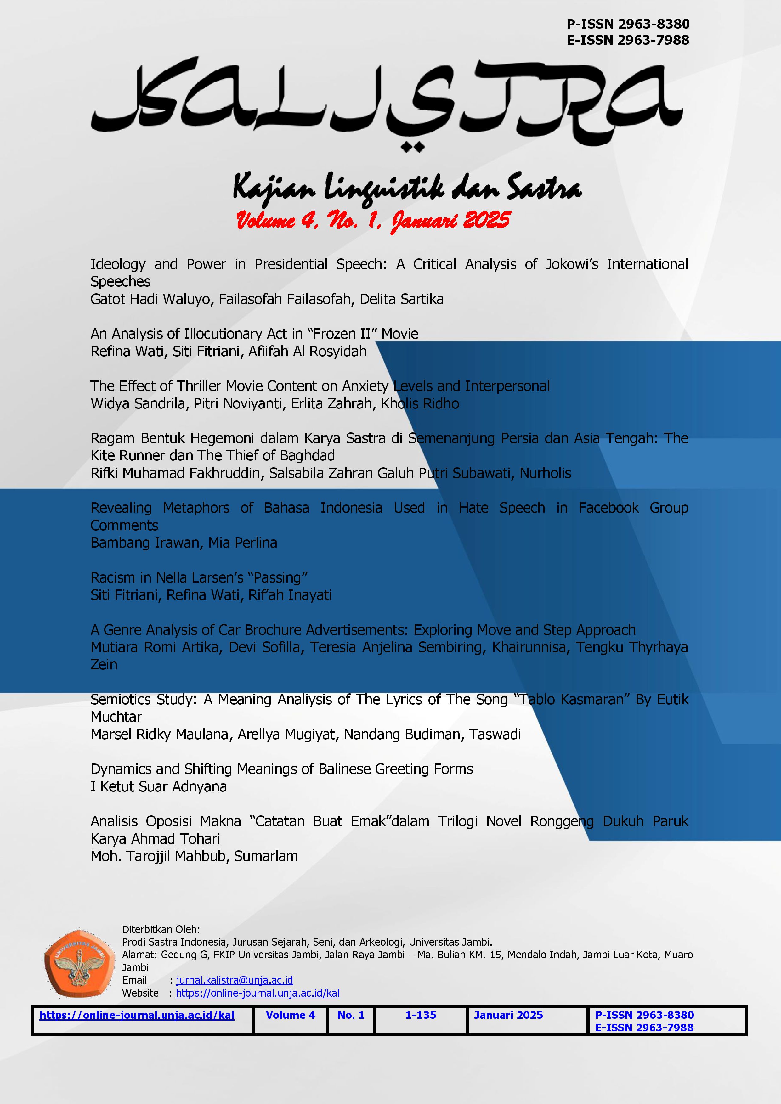 Pertiwi, N. P. D. Y. (2022). Politeness Strategies Used by The Characters In Frozen IIMovie. LITERA: Jurnal Bahasa Dan Sastra, 8(2).